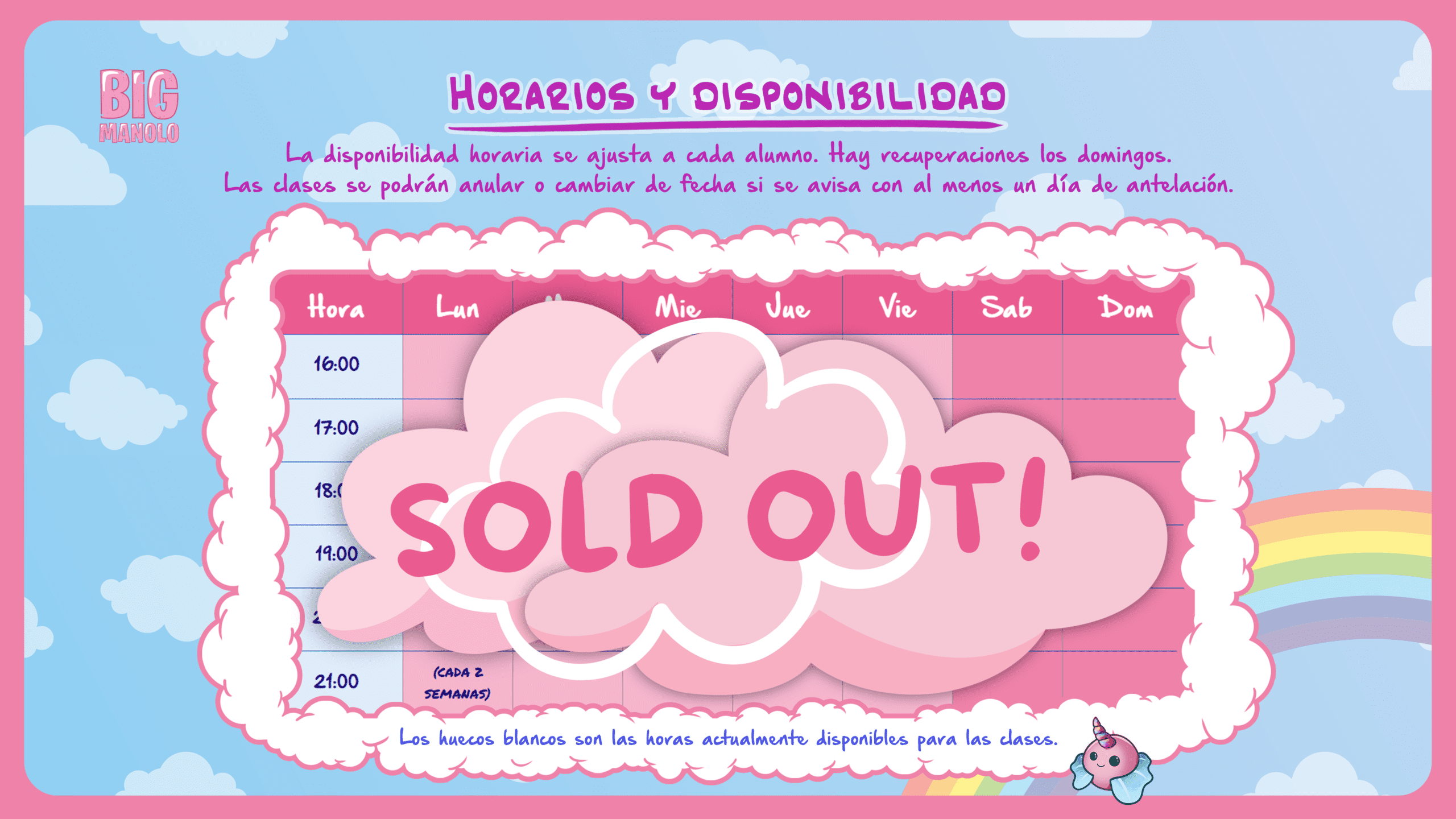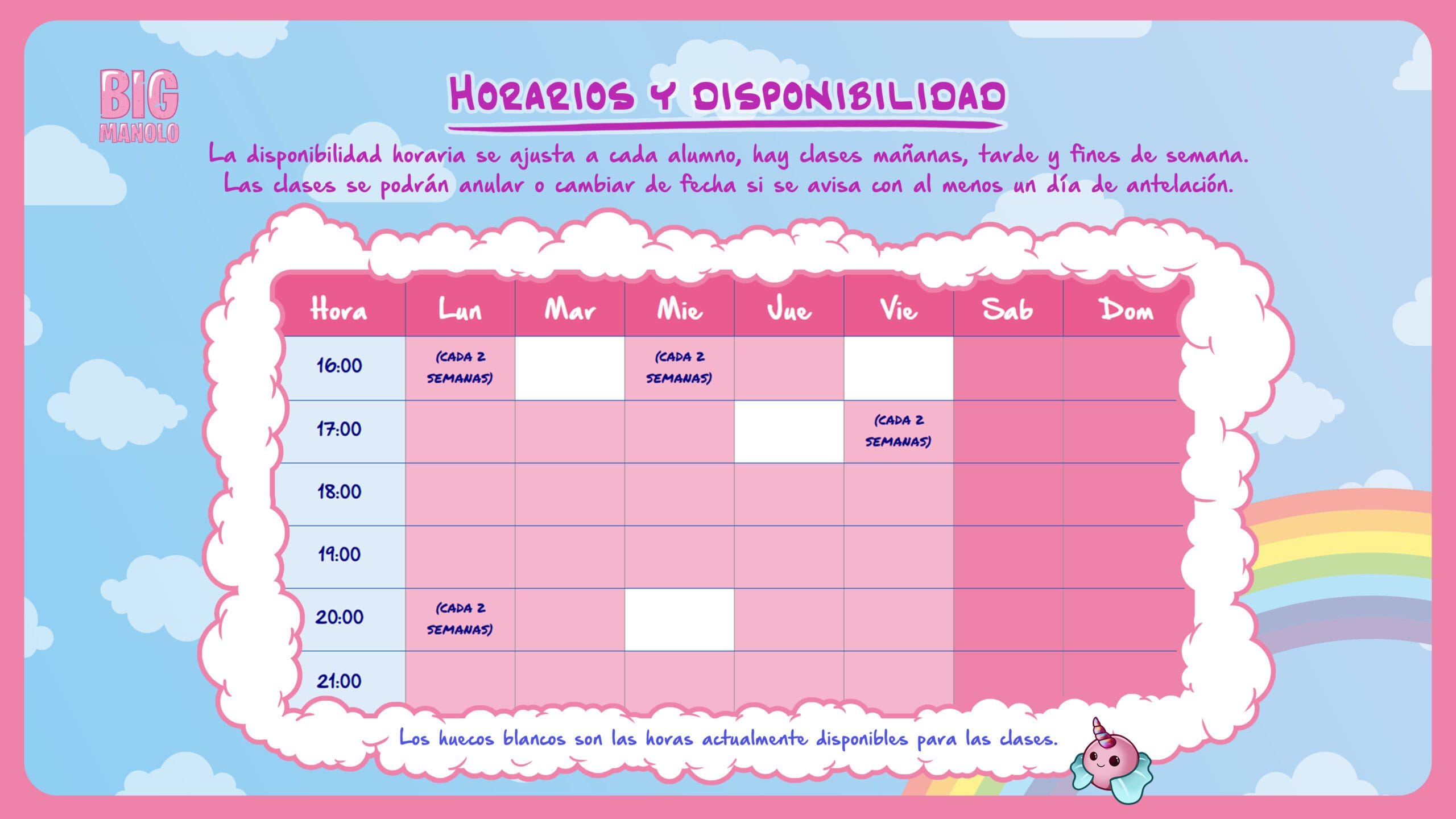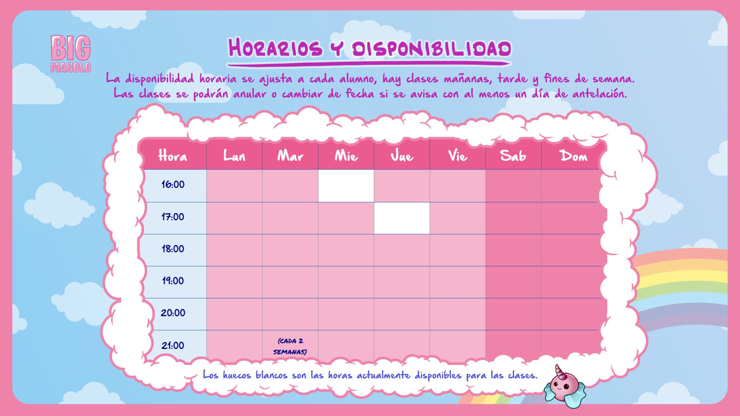 Con mis clases aprenderás igualmente online y desde casa, pero la personalización del aprendizaje será máxima. También tendrás un seguimiento de tu progreso y respuestas con contenido extra disponibles en cualquier momento. La disponibilidad horaria es muy amplia y flexible y abarca los siete días de la semana.
