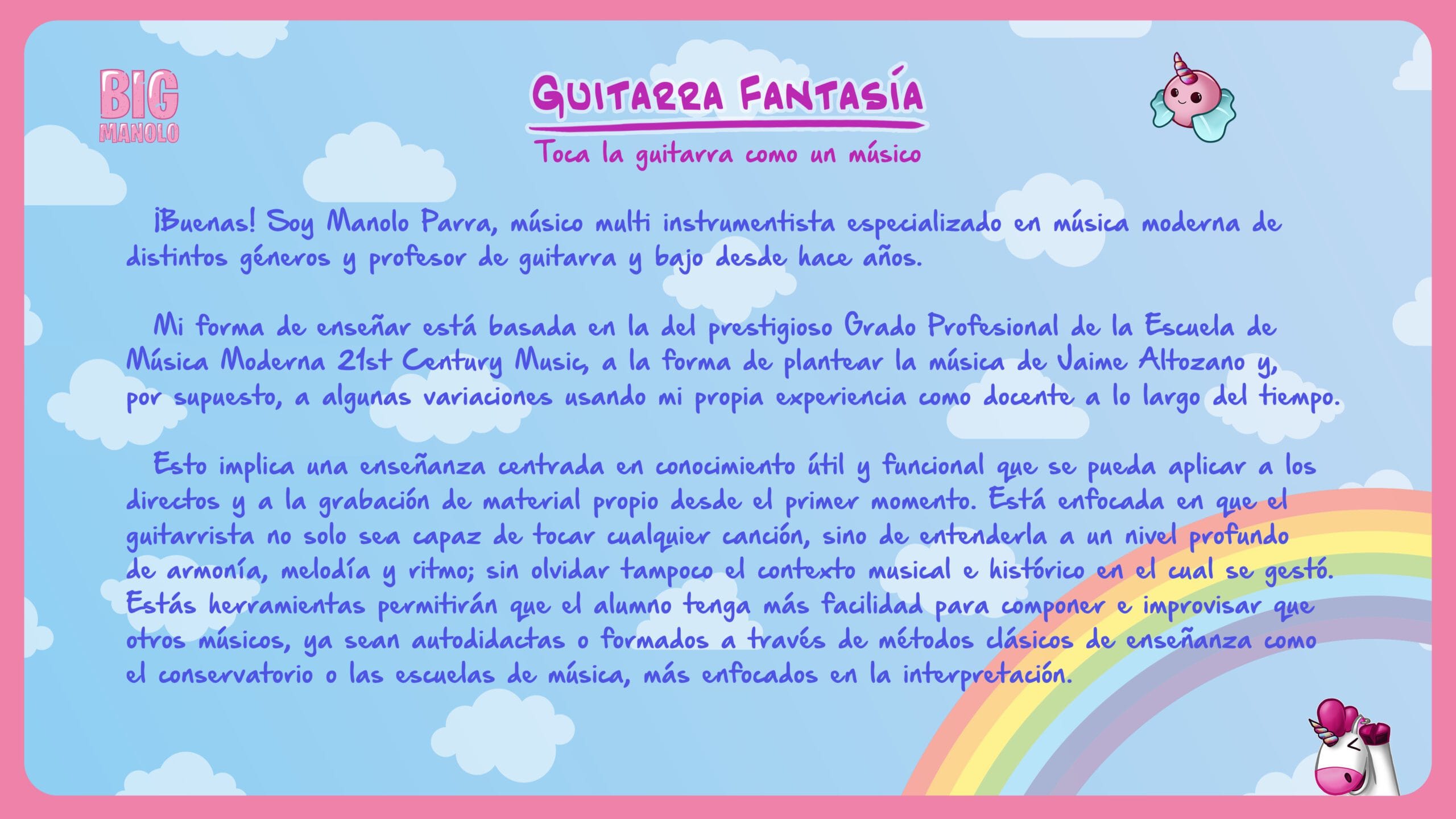 Esto implica una enseñanza centrada en conocimiento útil y funcional que se pueda aplicar a los directos y a la grabación de material propio desde el primer momento. Está enfocada en que el guitarrista no solo sea capaz de tocar cualquier canción, si no de entenderla a un nivel profundo de armonía, melodía y ritmo; sin olvidar tampoco el contexto musical e histórico en el cual se gestó.