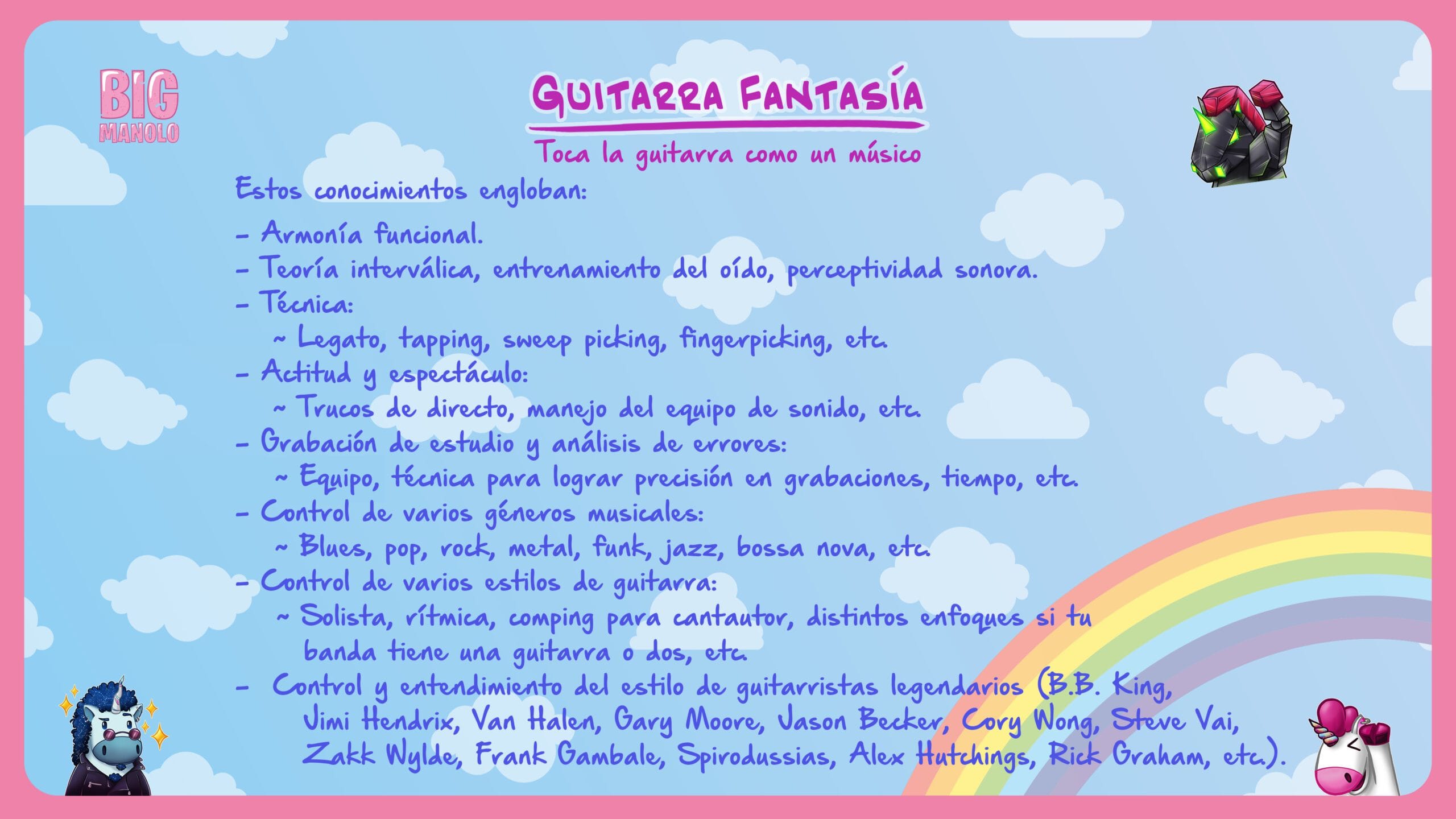 – Control y entendimiento del estilo de guitarristas legendarios (B.B. King, Jimi Hendrix, Van Halen, Gary Moore, Jason Becker, Steve Vai, Zakk Wylde, Cory Wong, Charlie Parra, Luca Turilli, Juan Valdivia, Rick Graham, Jared James Nichols, Frank Gambale, etc.).