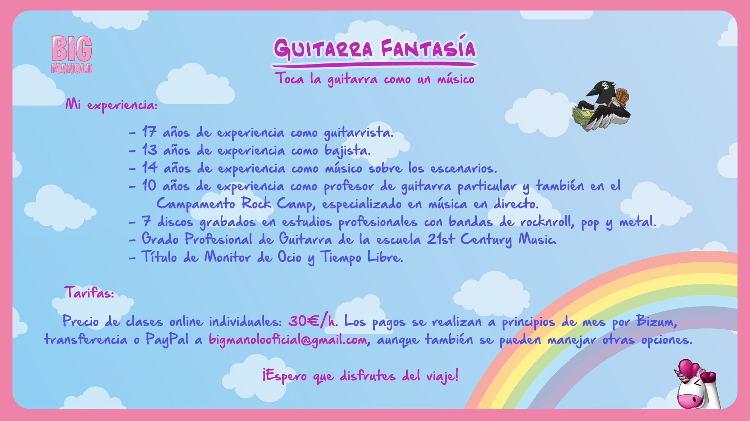 Las clases online mensuales de guitarra cuestan 25€/hora y se pagan con Bizum o transferencia a principio de mes. Contacta conmigo para tener más información o consultar otras opciones.